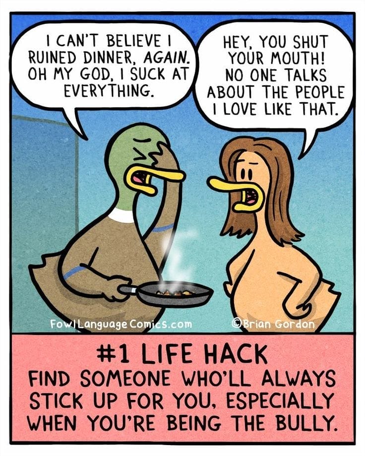 Burnt dinner? Doesn’t matter. This comic celebrates love and support in the face of self-loathing. “No one talks about the people I love like that!” It’s sweet, funny, and unexpectedly heartwarming.