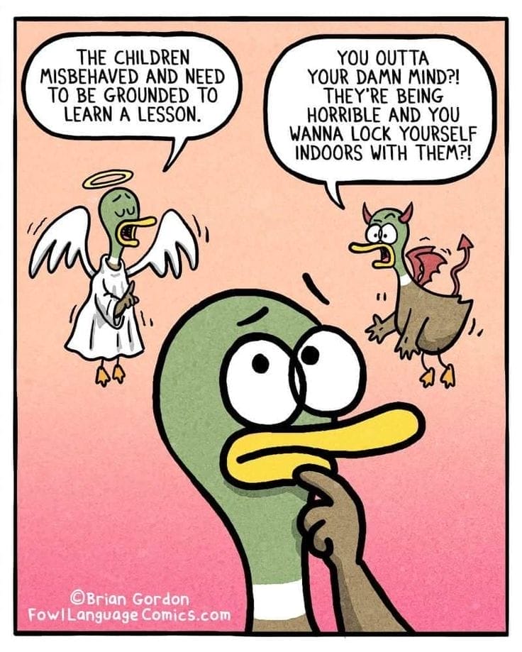 In one of his most relatable parenting struggles, Gordon visualizes the classic angel vs. devil battle over grounding the kids. The idea of locking yourself indoors with your misbehaving kids? Nightmare fuel. Funny because it’s so real.