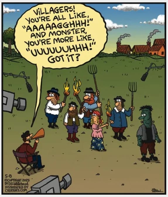 An angry mob rehearsing their screams? Yup, just another day in a monster movie set. This panel takes Frankenstein’s cliché to a new level with a director shouting line-readings to pitchfork-wielding extras. It’s a meta moment and one of Free Range’s most visually chaotic—and comically brilliant—panels.
