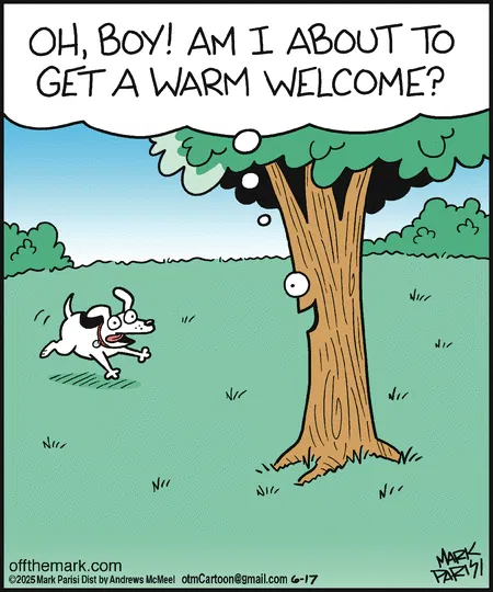 The eager pup thinks he’s heading toward a warm welcome. The tree disagrees. It’s cartoon collision comedy at its best.