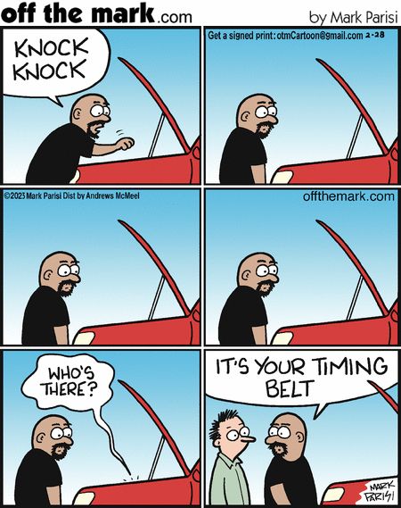The car mechanic becomes the butt of his own joke when his timing belt gives the worst knock-knock punchline ever. Car guys will feel this one.