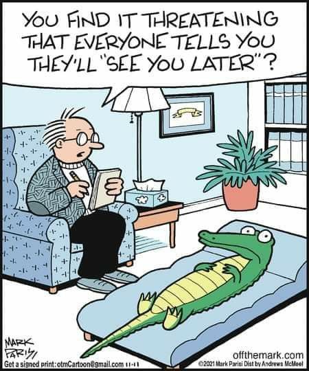 An alligator in therapy explains why “See you later” sends him into an existential crisis. Puns meet psychology—what’s not to love?