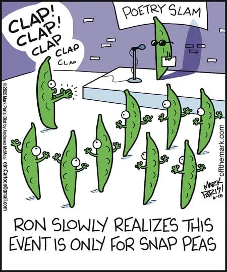 Ron didn’t realize the poetry slam was exclusively for snap peas. A brilliantly punny social faux pas with veggie flair.