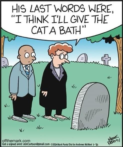 The comic delivers a punchline from the grave: “His last words were ‘I’ll give the cat a bath.’” May he rest in peace—and with no claw marks.
