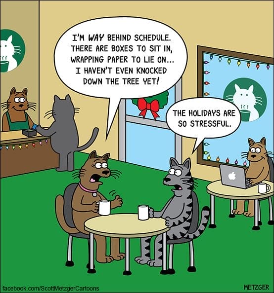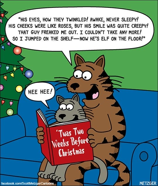 A frantic cat admits he’s behind on holiday chaos: knocking over trees, sitting in boxes, lying on wrapping paper. The stress is real. Metzger taps into every cat’s sacred duty to destroy holiday décor with passion and urgency.