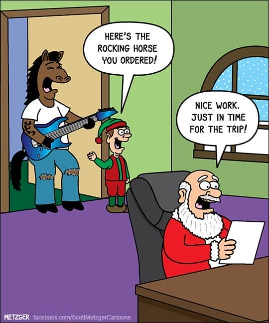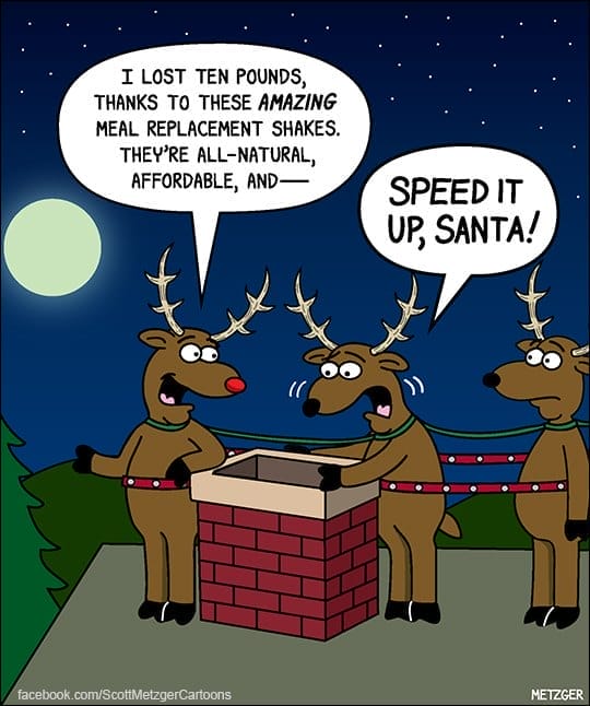 Santa’s reindeer pitch meal shakes mid-flight. “Speed it up, Santa!” one yells. This might be Metzger’s wildest one — and a perfect closer. Absurd, seasonal, and brilliantly timed.