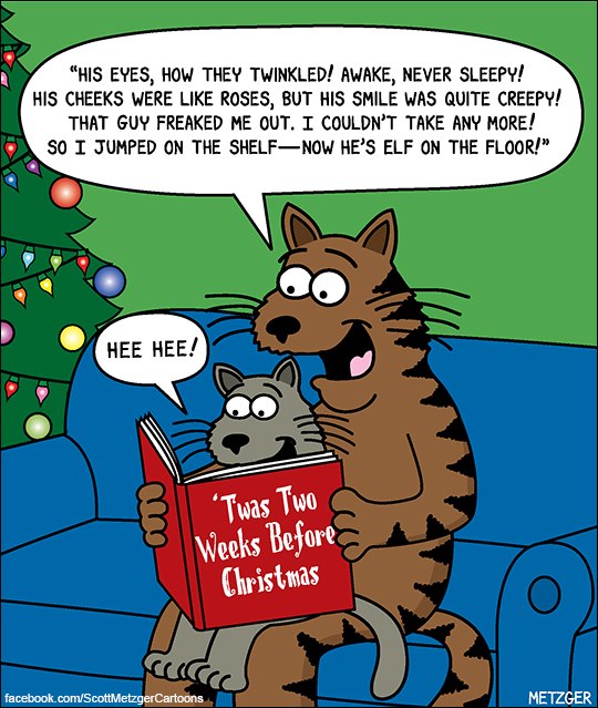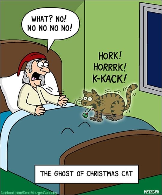 It’s midnight. The cat is hacking up a festive hairball, and the human’s horror screams could wake the dead. A masterful blend of seasonal cheer and gross-out comedy — Metzger style.