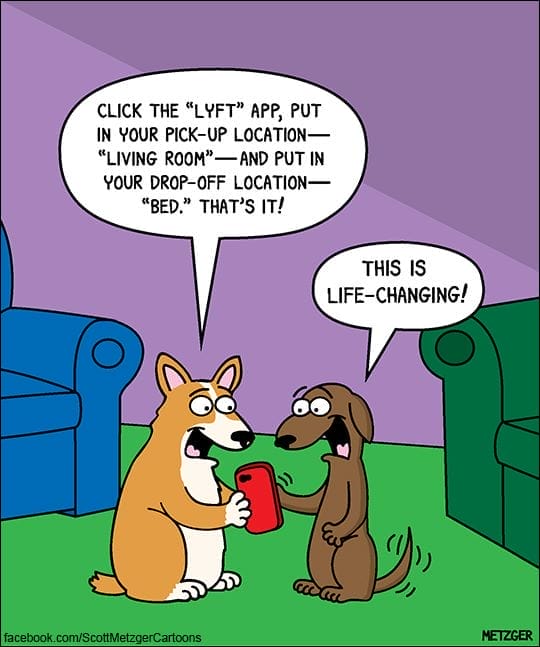 Okay, this one’s for the dogs — but it’s too good. A dog shows another how to use the “Lyft” app to go from living room to bed. “This is life-changing!” Absolutely. Even your cat would approve.