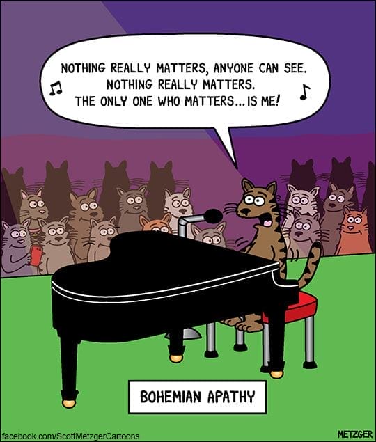 A moody cat belts out a Queen parody on piano: “Nothing really matters… the only one who matters is me.” If cats had rock bands, this would be their anthem. Paws down.