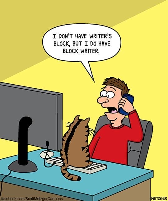 A man tries to work but his cat sits between him and his keyboard. “I don’t have writer’s block, but I do have block writer.” Wordplay at its finest — and most relatable.