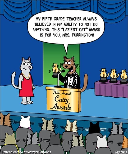 At the 76th Annual Catty Awards, a smug feline thanks their fifth-grade teacher for believing in their ability to do… nothing. It’s a feline Oscar speech dripping in shade and laziness. Brilliantly cat.