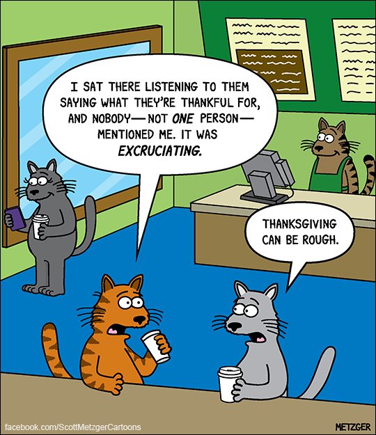 One cat vents about being left out of the Thanksgiving gratitude list. No one said his name. Not one person. Metzger captures peak passive-aggressive cat energy with spot-on human parallels.