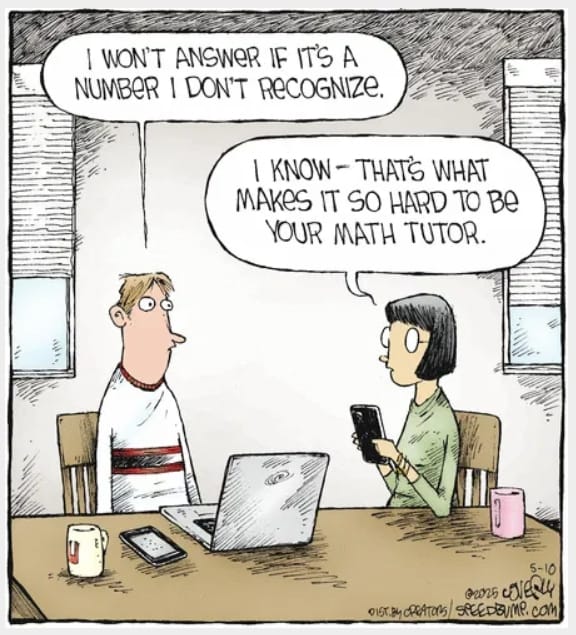 A student’s refusal to answer unrecognized numbers becomes a math tutor’s nightmare. The comic is a witty jab at both numeracy and screen addiction. Clever dialogue, perfect expression work.