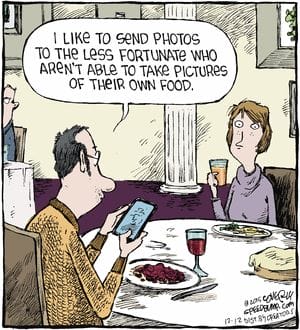 A man self-righteously shares food photos with the “less fortunate”—those who can’t Instagram. The gag roasts influencer culture with a spoonful of irony. Chef’s kiss, Dave.