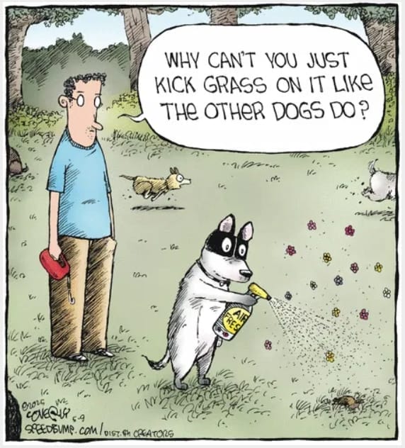 This cartoon is a pet-owner favorite. A dog with air freshener critiques nature’s potty norms. Coverly taps into human quirks reflected through animals, making the joke instantly relatable and sniff-worthy.