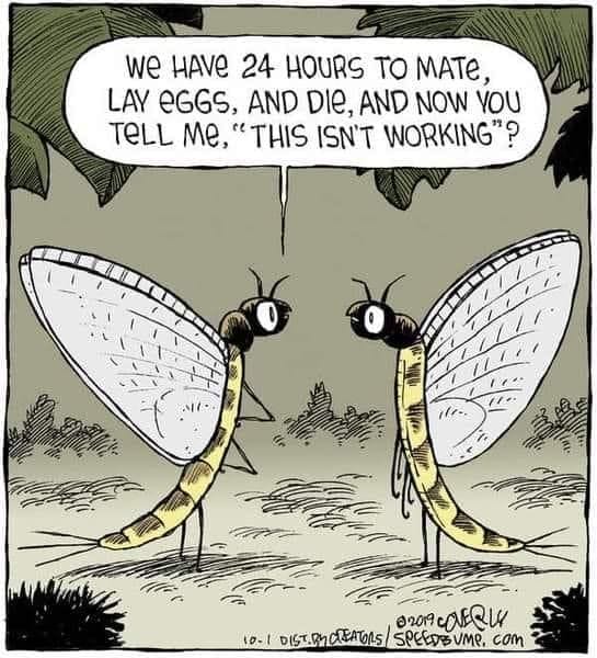 With only 24 hours to live, these mayflies are facing a relationship crisis. Coverly brilliantly parodies modern couple talk in the most biologically doomed scenario ever. Equal parts cute and existential.