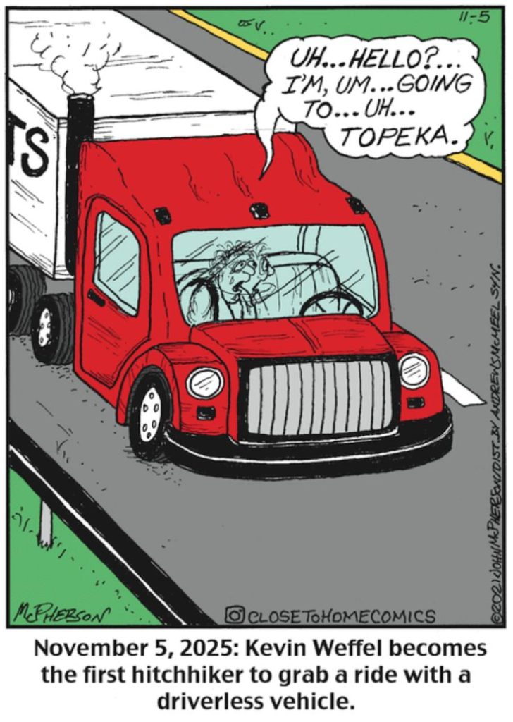 The future is here, and so are awkward conversations with driverless trucks. This panel captures the sheer absurdity of hitchhiking with an AI… who never answers.