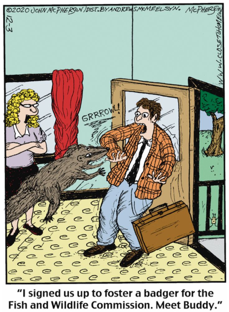 “I signed us up to foster a badger.” A sentence that ends in chaos. This comic takes the idea of pet adoption and throws it into wildlife management gone rogue.
