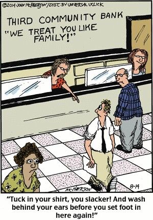 When your bank claims “we treat you like family,” you’d better be prepared to get yelled at for wrinkled shirts and unwashed ears. Brutal… and so relatable.