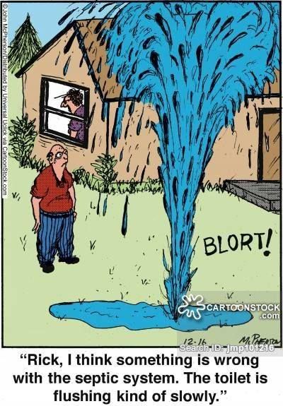 “Flushes slowly,” she says, while the backyard explodes in a blue geyser of plumbing horror. This is what happens when you ignore those little toilet noises.