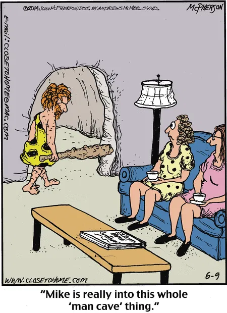 Move over gaming basements. This guy literally digs a “man cave” — complete with a club and loincloth. The ladies on the couch sip tea like it’s completely normal. Spoiler: It is not.