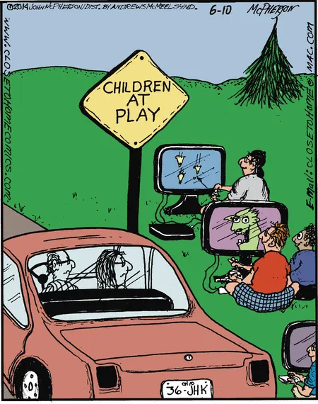 A “Children at Play” sign outside a group of kids… glued to video games. Satirical and spot-on, this comic nails our screen-obsessed generation in one savage panel.
