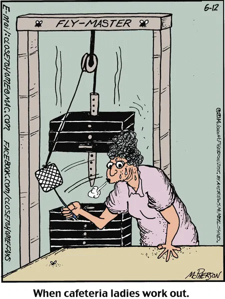 Need gym motivation? Picture your school lunch lady cranking out fly-swatting reps on a “Fly-Master” machine. Fitness meets food service in the most terrifying crossover yet.