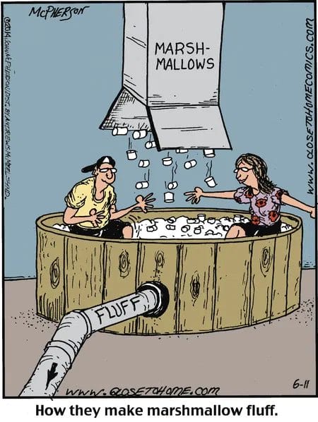 Ever wonder how marshmallow fluff is made? Apparently, it involves people soaking in a tub while being showered with sugar pillows. That’s one sticky job we might actually apply for.