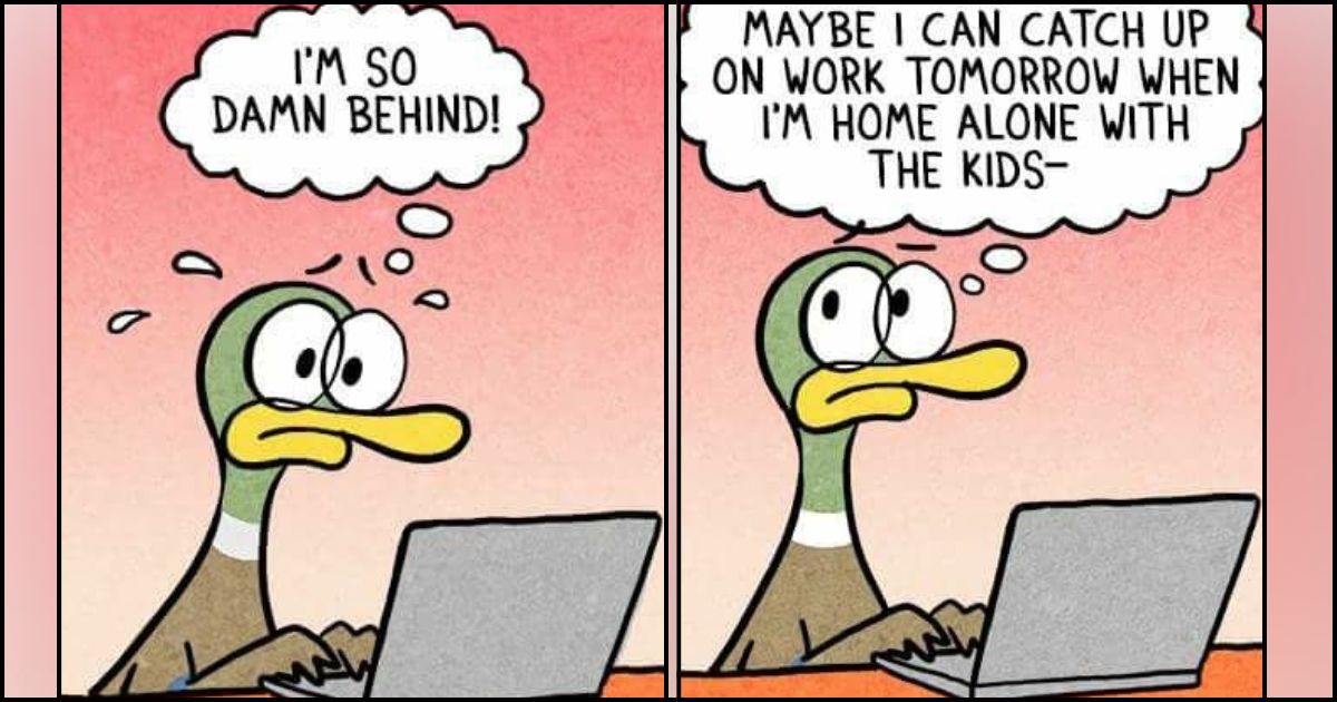 “Maybe I’ll get work done while the kids are home.” Cue: maniacal laughter. Relatable parenting comics have never hit so close to the bone.