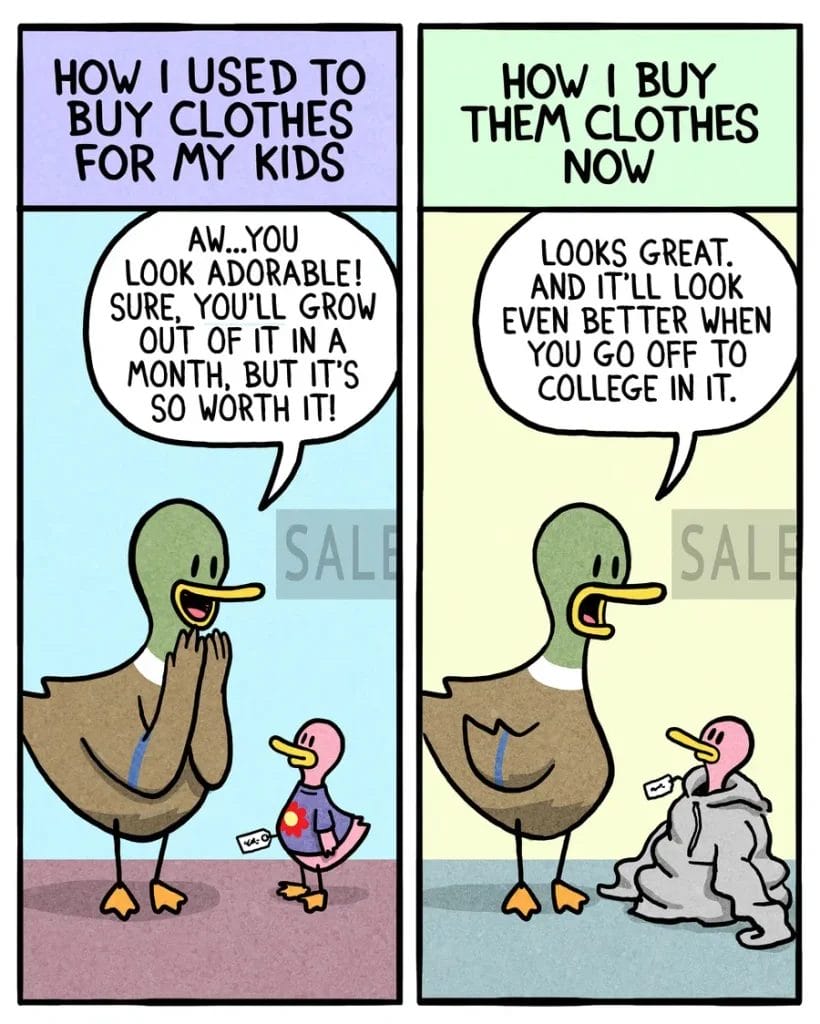 Remember when you bought cute, impractical outfits for your kid? Yeah, now it’s “will this fit you in college?” Brian Gordon’s signature wit shines here, with a side of thrift-store guilt. Parenting humor at its finest!