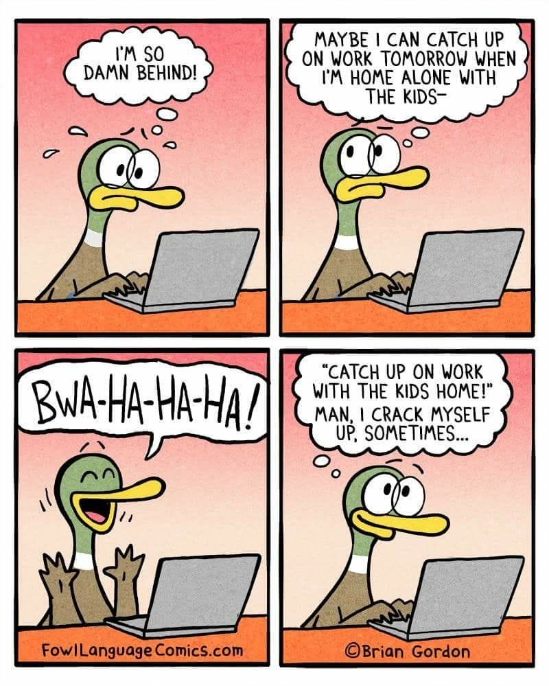 “Maybe I’ll get work done while the kids are home.” Cue: maniacal laughter. Relatable parenting comics have never hit so close to the bone.