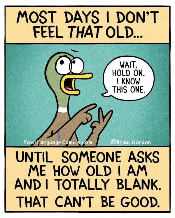 When you can’t remember how old you are, but your kids are keeping score. Parenting humor cartoons, but make it existential.