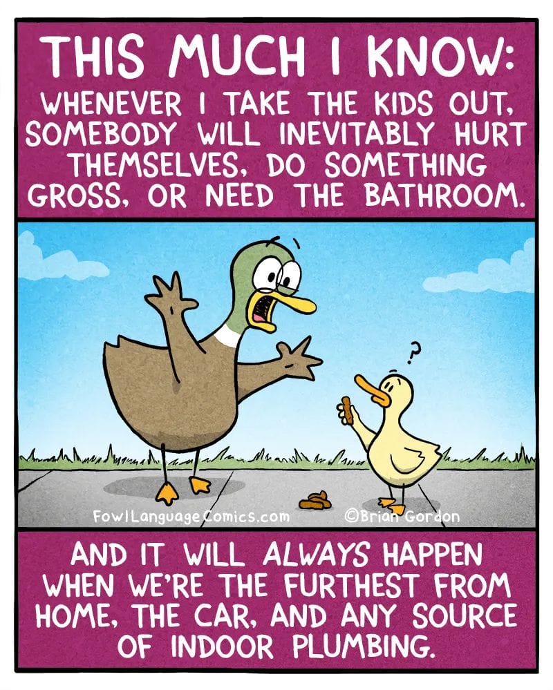 Wherever you go, disaster follows—usually the farther from home, the more urgent the bathroom needs. Funny Parenting Comics don’t lie!