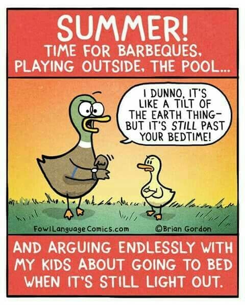 “Why is it bedtime if the sun is still out?”—a classic kid logic puzzle. This panel brings every parent’s summer-night struggle to life with a burst of sunshine and a hint of parental desperation.