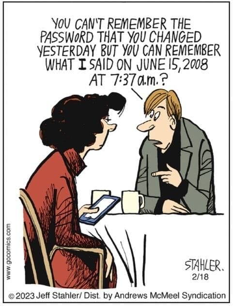 One of Stahler’s sharpest takes on memory and grudges. The boyfriend can’t recall yesterday’s password, but his partner remembers every syllable from a 2008 argument. The comic hilariously mirrors how relationships function — with love, loyalty… and a long memory for slights.