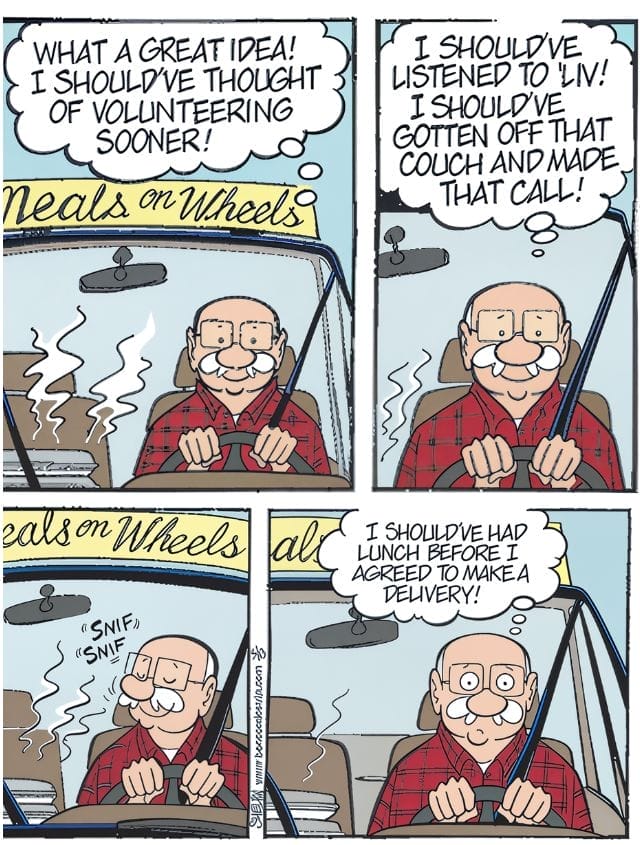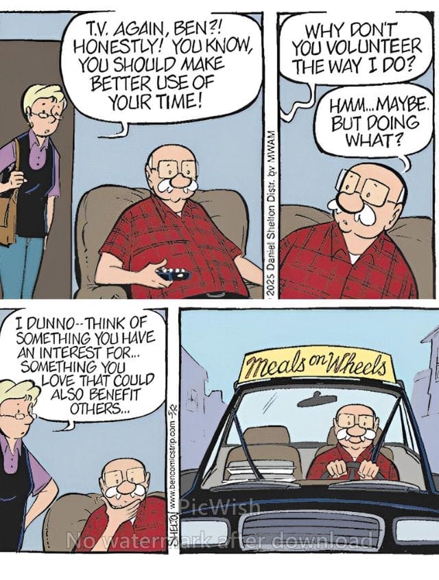 Ben’s wife pushes him to do something meaningful. So naturally, he finds a way to turn couch potato energy into Meals on Wheels delivery runs. It’s oddly inspiring — and definitely good for a laugh. The strip blends humor with heart in the best way possible.