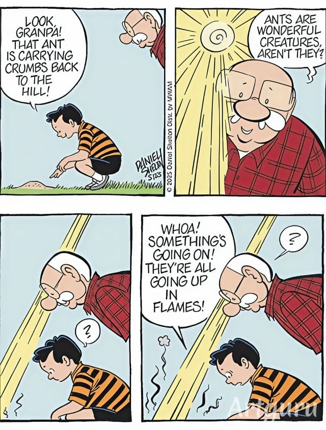 Ben and his grandson marvel at ants — until sunlight takes a dark turn. Suddenly, it’s all smoke and horror as the ants “go up in flames.” This strip walks the line between innocent and shockingly funny in a way only Shelton can pull off.