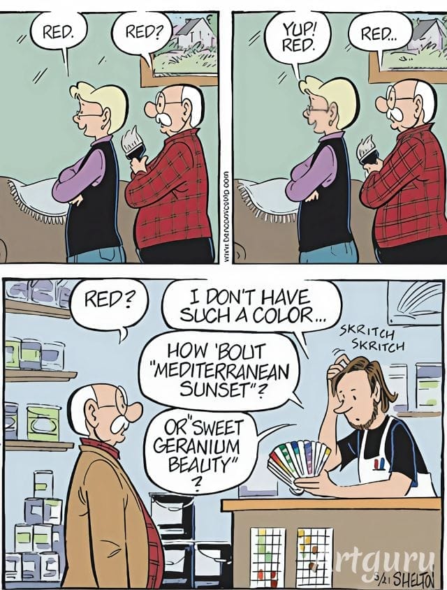 Ben wants red paint. Just red. But modern paint names aren’t that simple. When offered “Mediterranean Sunset” and “Sweet Geranium Beauty,” his confusion becomes our comedy. It’s a clever take on the disconnect between old-school simplicity and today’s branding excess.
