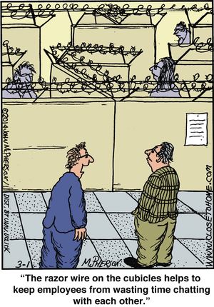 Talk about cutting office chatter. This visual of cubicles lined with razor wire nails the oppressive extremes of corporate “productivity enhancement.”