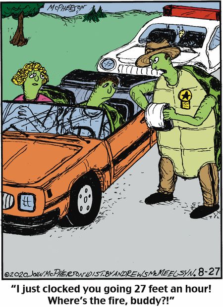 Only in this comic world do turtle cops issue citations to turtle drivers for “speeding” at 27 feet per hour. Slow and steady loses the race again.