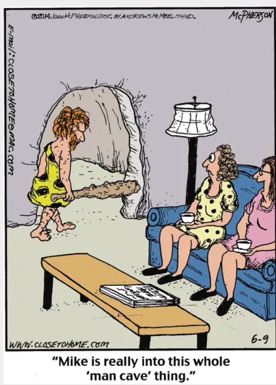 When Mike took the “man cave” concept seriously, he went full Neanderthal. Complete with animal pelts and a club. His buddies might be rethinking that term now.