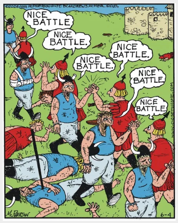 Forget handshakes after a football match — try it after a blood-soaked medieval melee. This comic serves up dark comedy with a dash of savage etiquette.