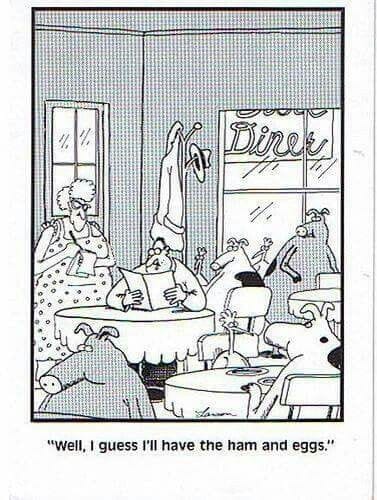 A pig casually orders “ham and eggs” in a diner full of farm animals. Awkward silence follows.