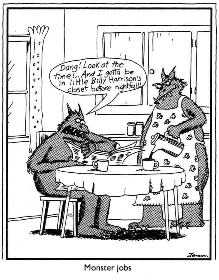 Two monsters over coffee discuss their schedule. Turns out even closet monsters have time clocks.