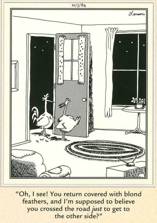 A chicken’s mate returns home “covered in blond feathers.” So much for the old “just crossed the road” excuse.