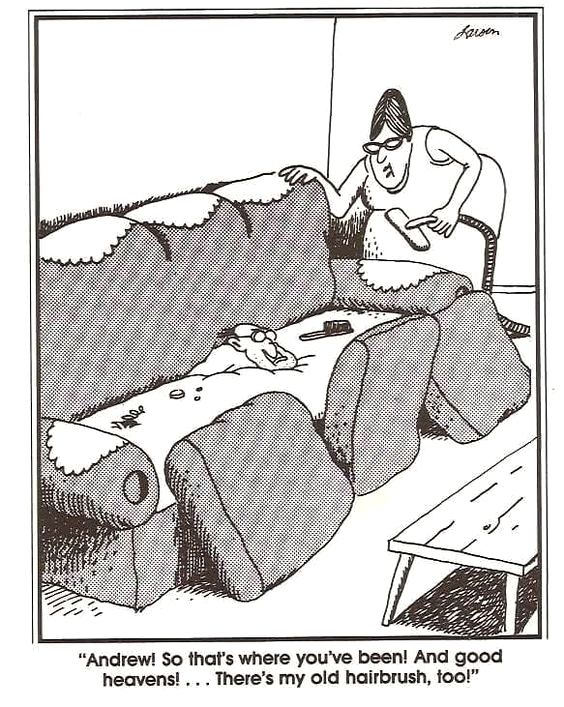Lost pet? Nope—Andrew’s been living under the couch cushions along with a hairbrush and possibly an ecosystem.