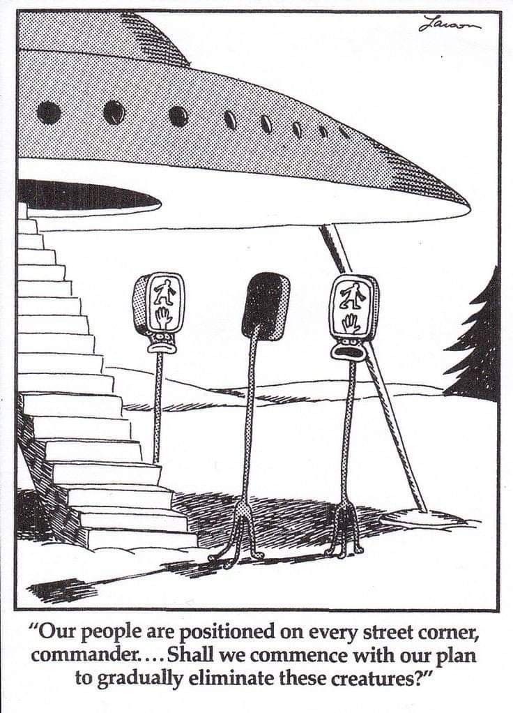 Aliens disguised as pedestrian signal lights plot Earth’s downfall. We’ve all been warned.