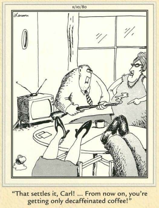 Carl’s had too much coffee—and possibly a vendetta against the TV. Decaf for life, buddy.