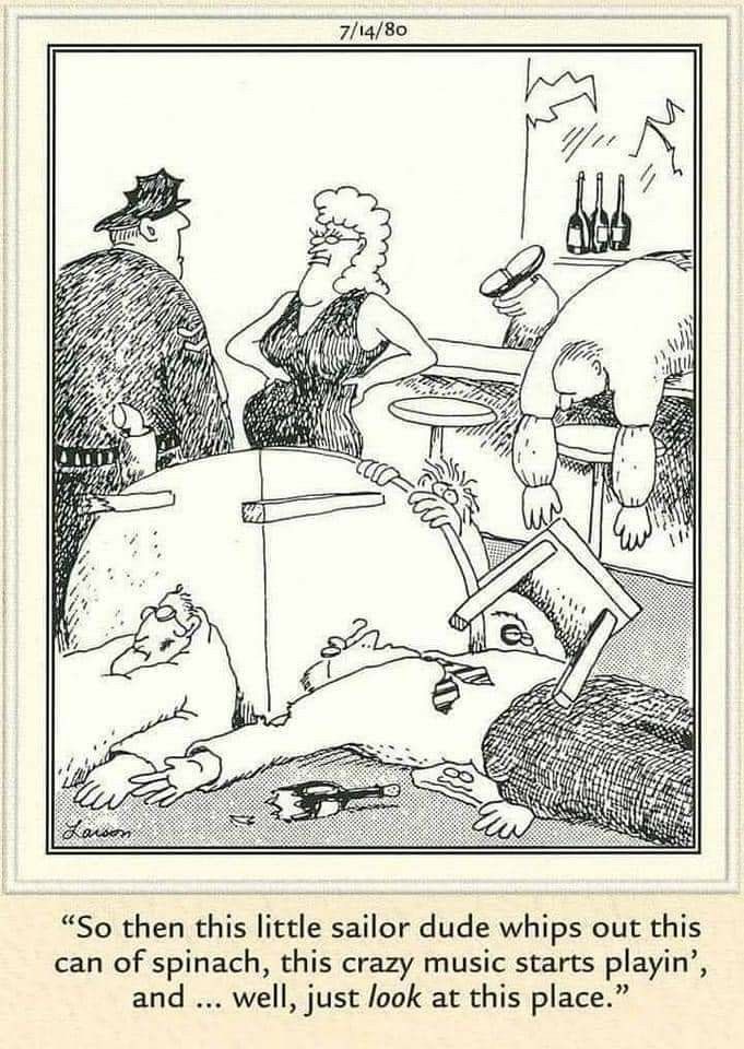 A bar fight erupts after a sailor eats spinach. A sly nod to Popeye with Larson’s trademark aftermath-focus.