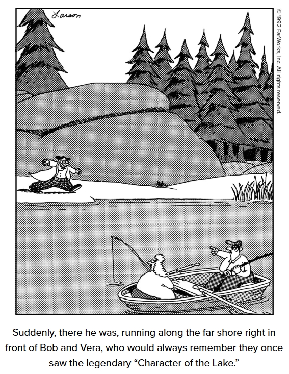 Two boaters spot the mythical “Character of the Lake.” The lake is never boring if you look close enough.
